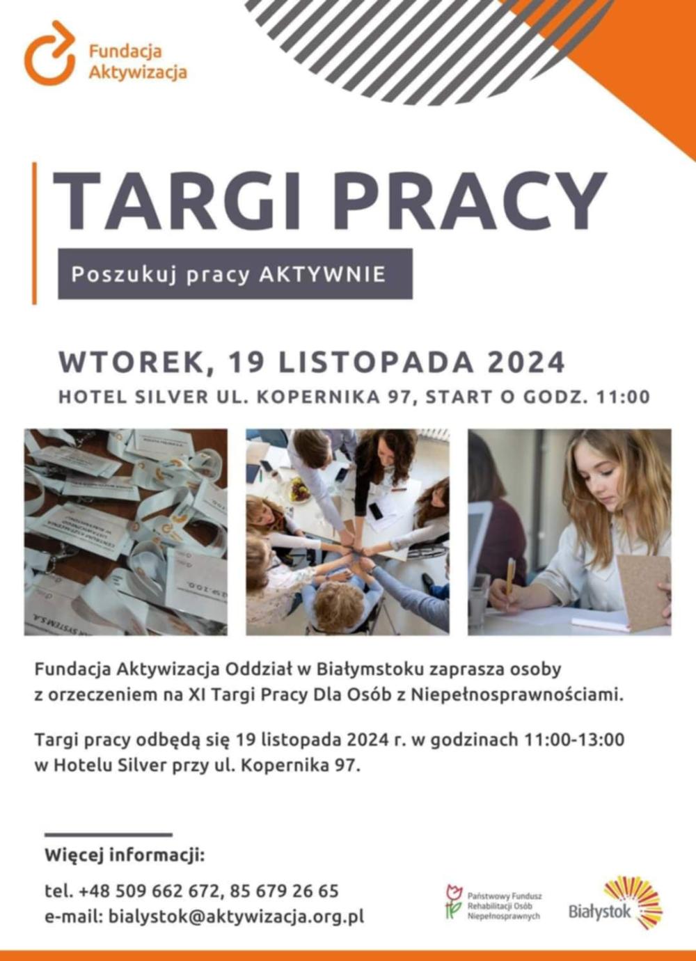 19 listopada 2024 r. w Hotelu Silver w Białymstoku odbyły się XI Targi Pracy dla Osób z Niepełnosprawnościami, zorganizowane przez Fundację Aktywizacja, we współpracy z Miastem Białystok. Ideą przewodnią Targów była promocja przedsiębiorczości firm tworzących miejsca pracy dla osób z niepełnosprawnościami oraz wspieranie ich aktywizacji zawodowej. Pracodawcy mieli okazję zaprezentować swoje oferty pracy, zaś osoby poszukujące zatrudnienia mogły bezpośrednio poznać przedstawicieli firm, zdobyć informacje o dostępnych ofertach zatrudnienia, staży i praktyk, a także skorzystać z porad dotyczących możliwości rozwoju zawodowego.